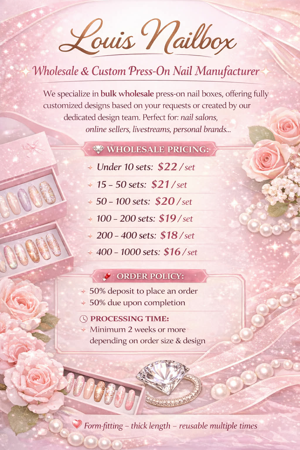 We specialize in bulk wholesale press-on nail boxes offering fully customized designs based on your requests or created by our dedicated design team.