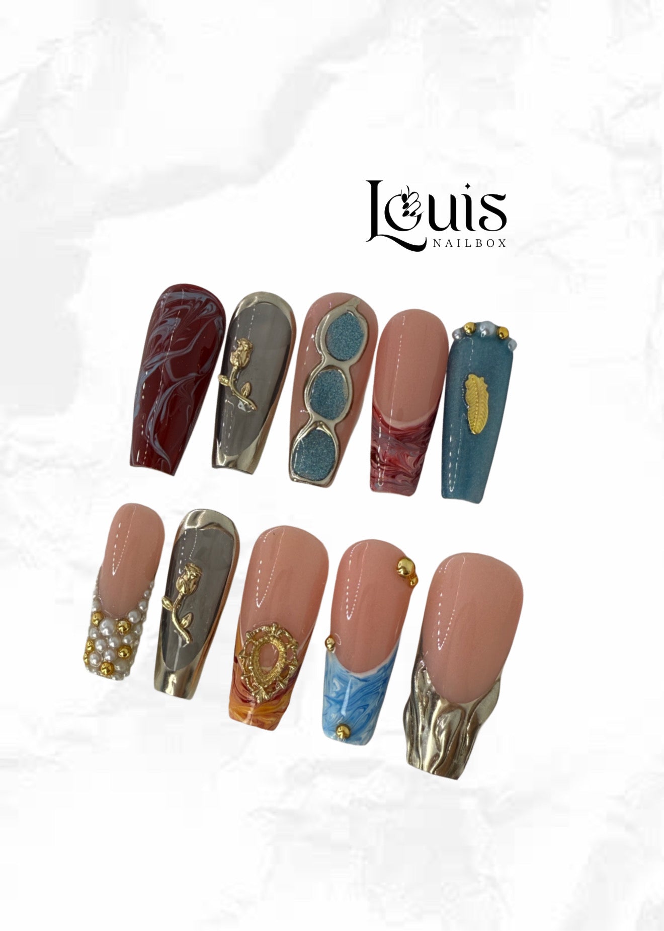 Elevate your style with our Artistic Mosaic LouisNailBox! Showcasing colorful marble effects, gold accents, and intricate embellishment included.