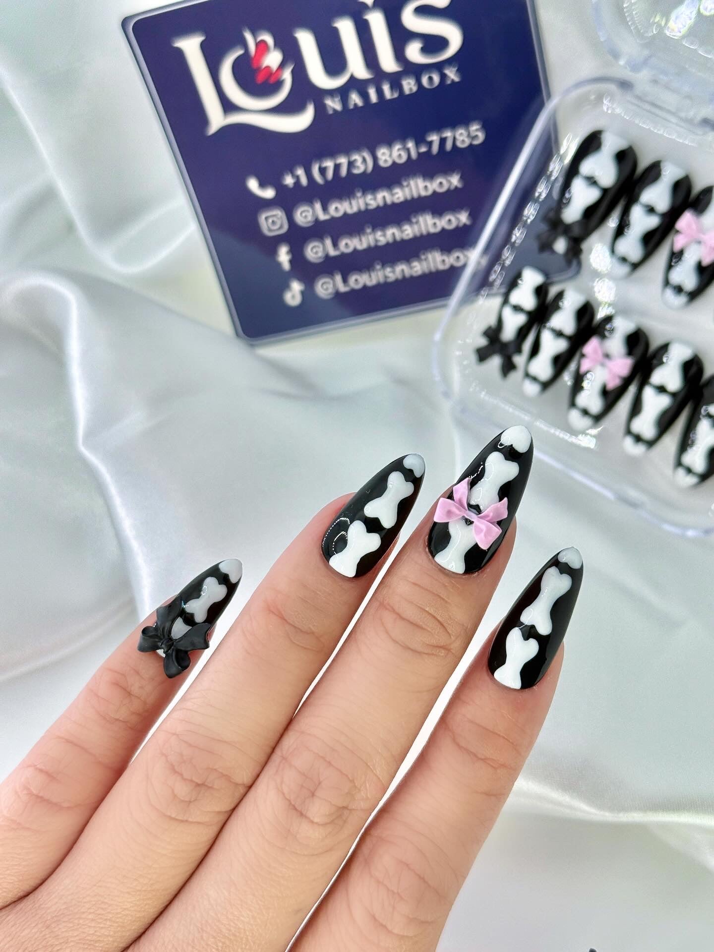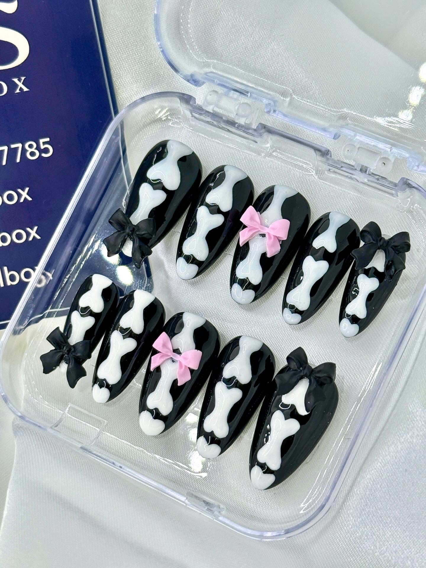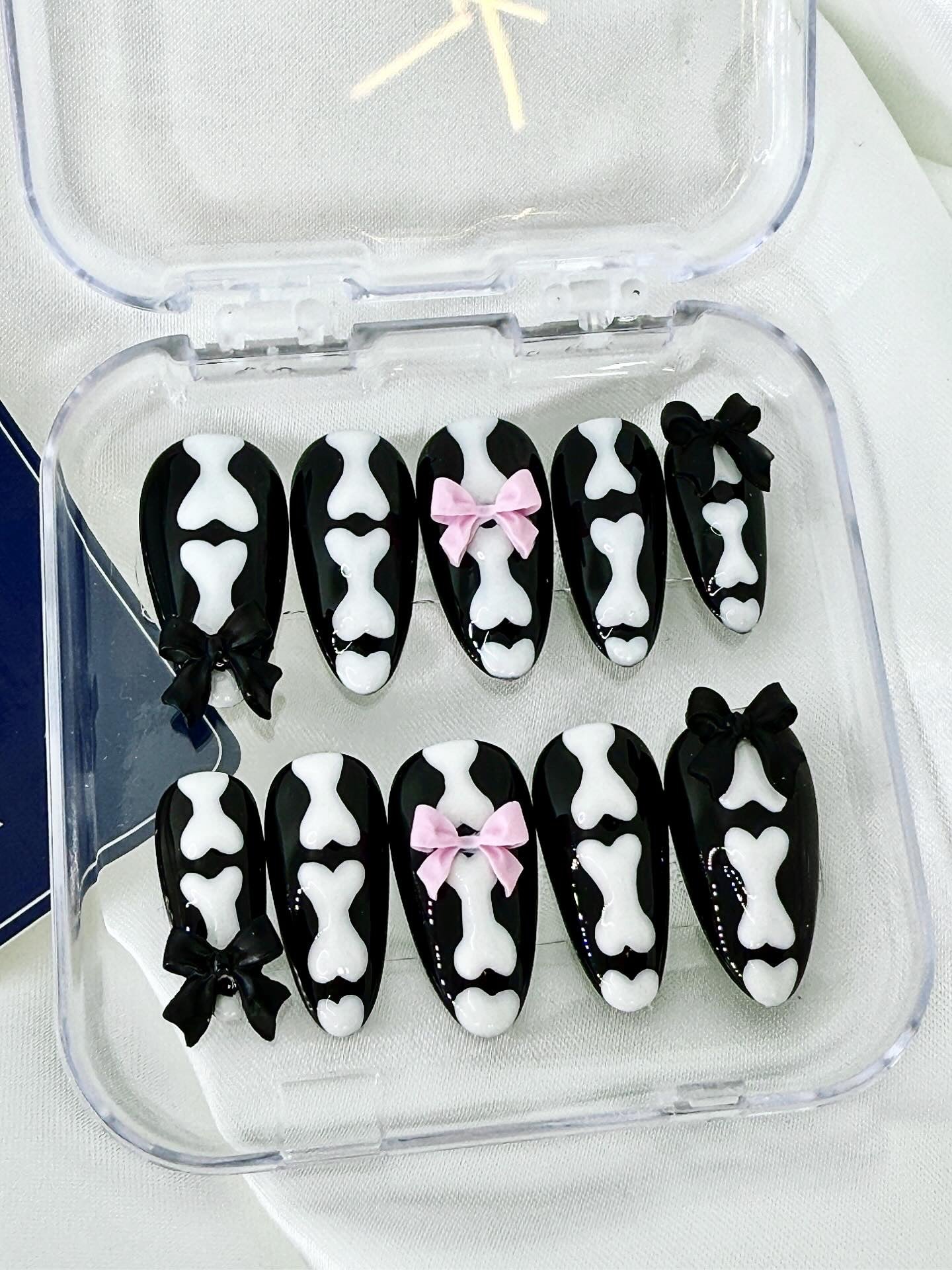 Celebrate Halloween with a touch of sophistication with our Bone Cutie Press-On Nails! Adorned with sparkling rhinestones and chic bows, these durable nails blend classic and modern styles. Simple to apply with adhesive included, ideal a fun Halloween!