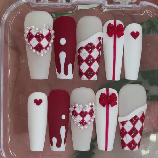 Fall for plaid romance with our Checkered Heart LouisNailBox! Gingham patterns in red and white, heart motifs, lace bows, and pearl details on nude bases for a sweet, vintage-inspired look.