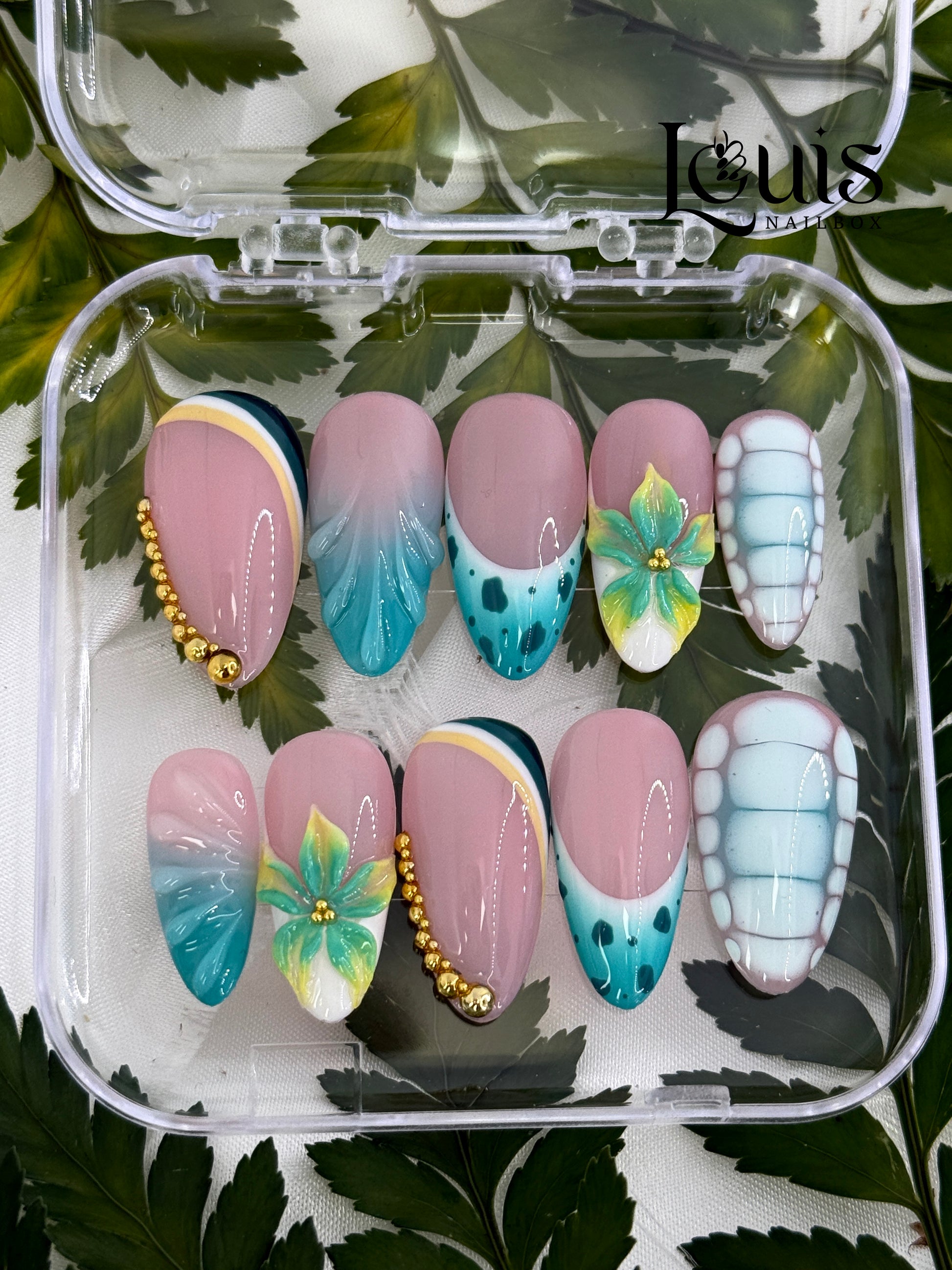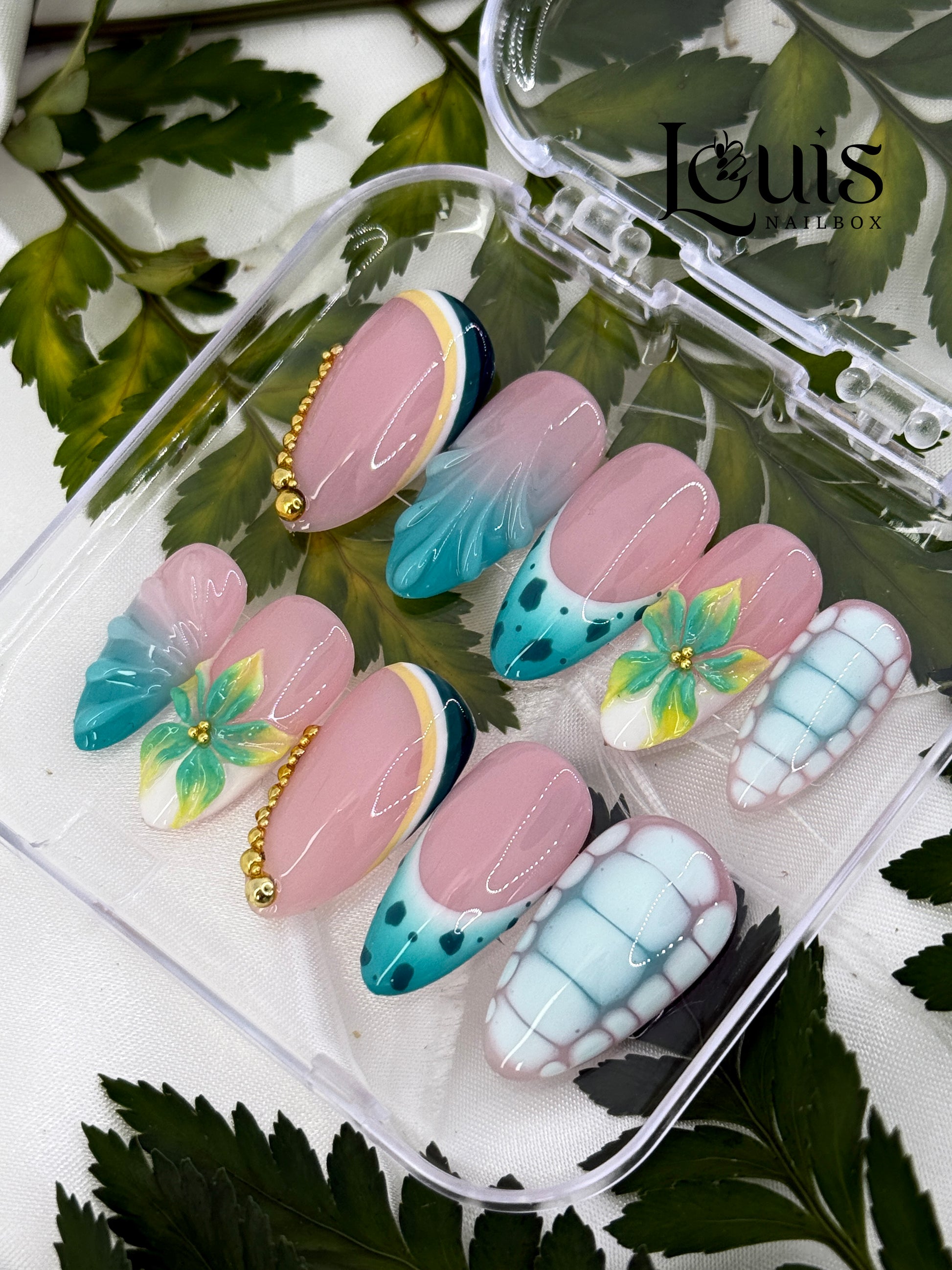 Unleash exotic elegance with our Crocodile Bloom LouisNailBox! Textured crocodile prints in teal, paired with 3D hibiscus flowers, gold bead chains, and pink ombres for a fierce, tropical statement.