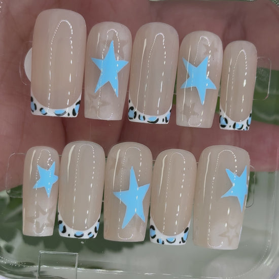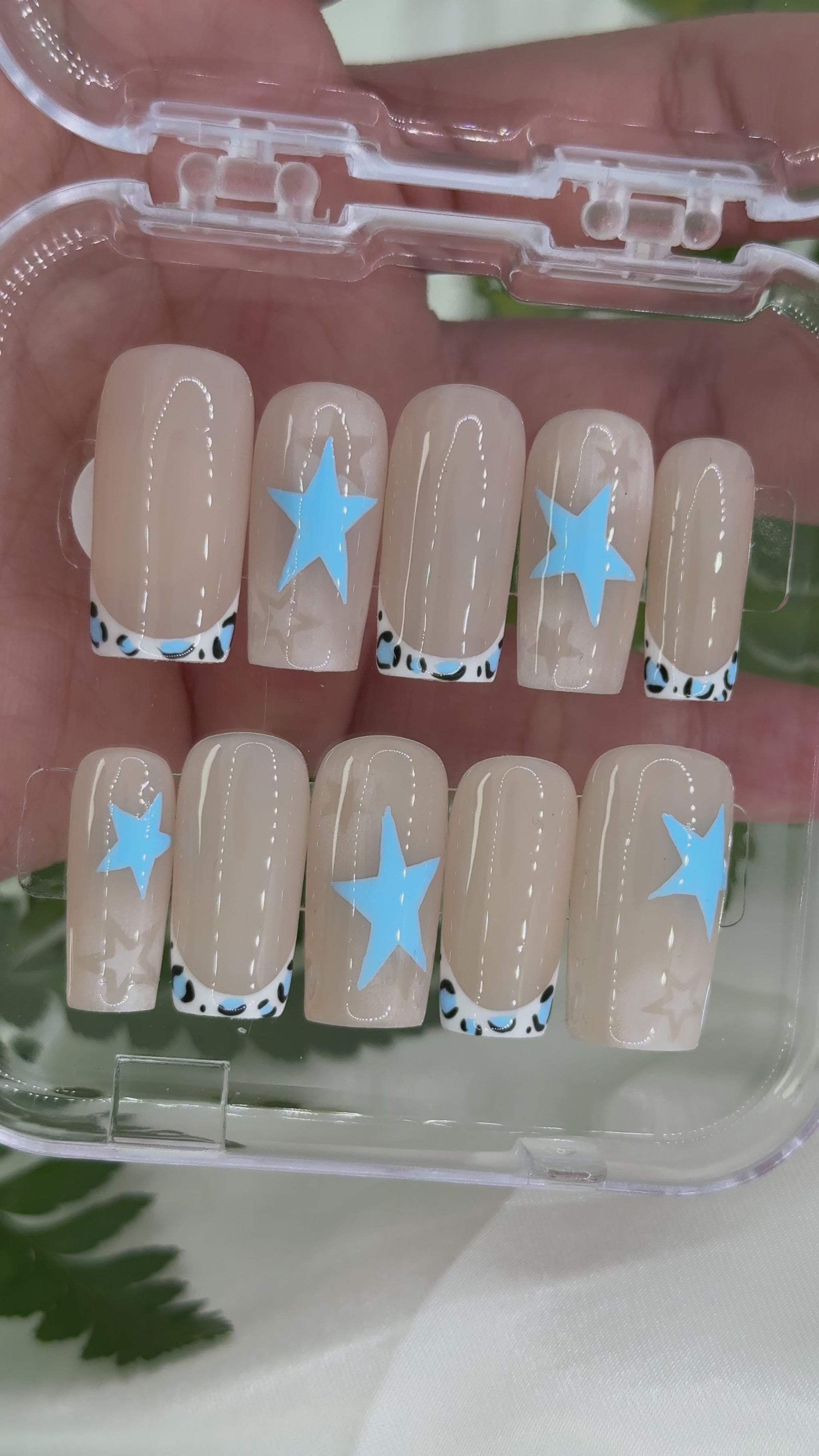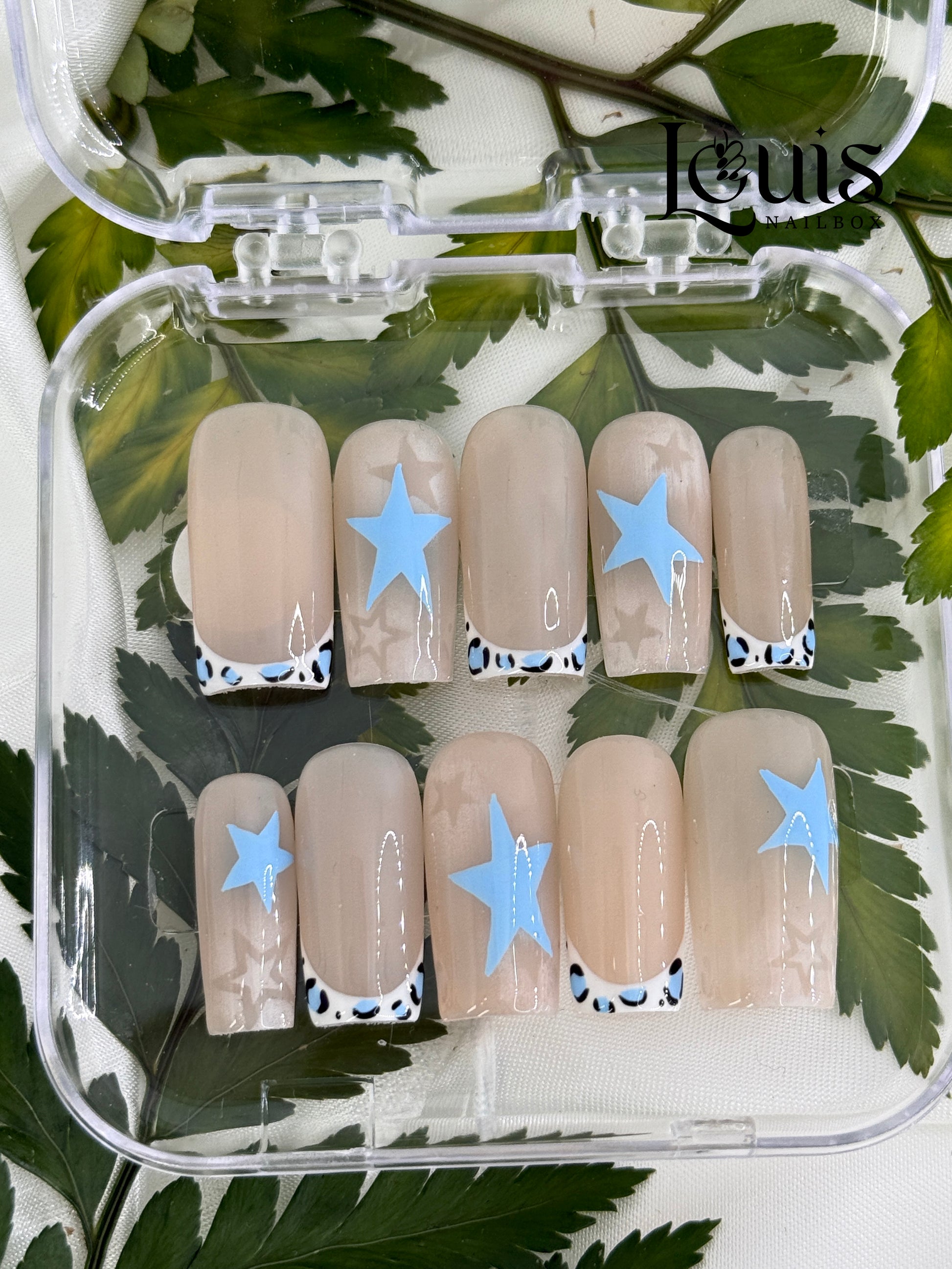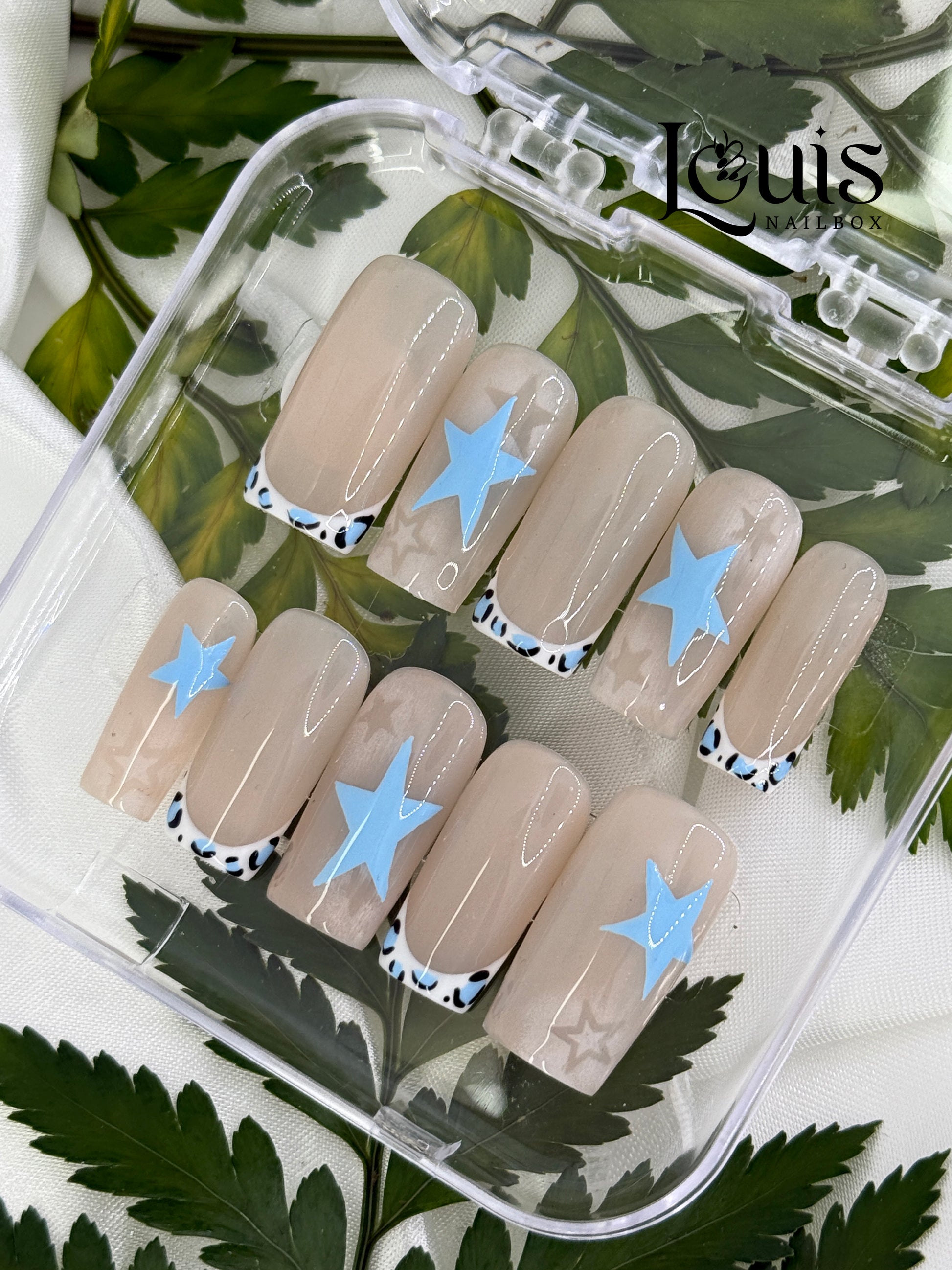 Roar softly with our Leopard Star LouisNailBox! Nude bases dotted with blue star decals, subtle leopard spots, and white French tips for a playful, edgy yet chic vibe.