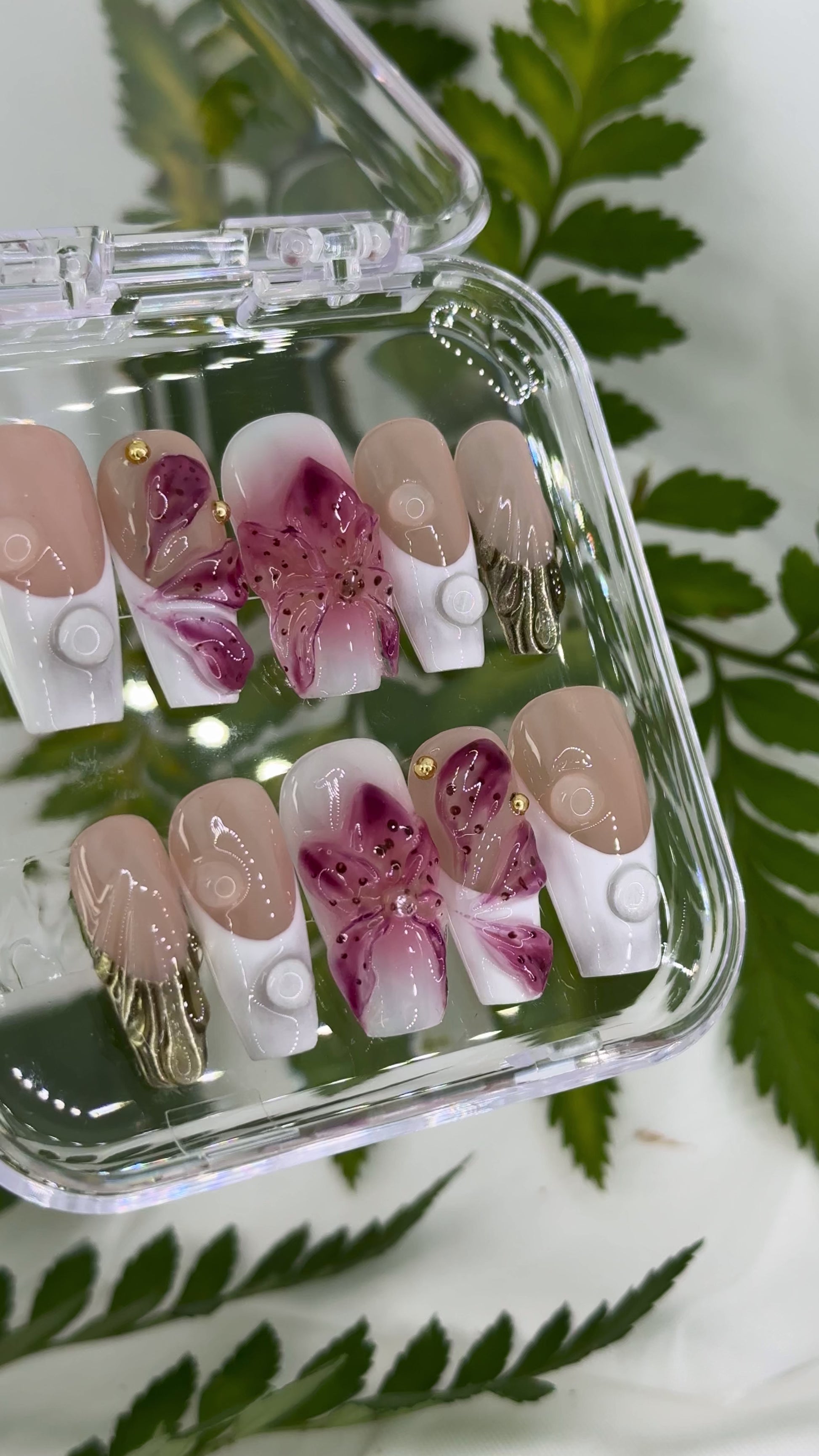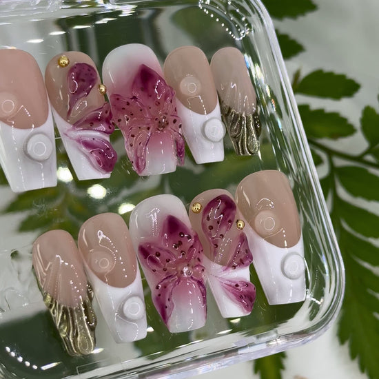 Blossom with sophistication in our Orchid Pearl LouisNailBox! Vibrant purple orchids, pearl buttons, gold chains, and white French tips on nude bases for an exotic, elegant allure.