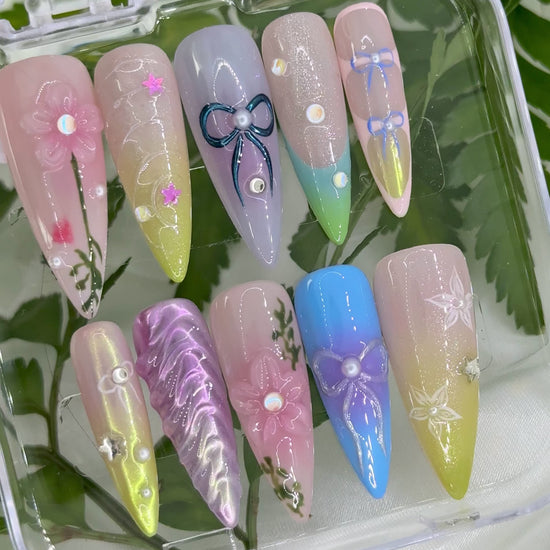 Bloom with soft whimsy in our Pastel Garden Bow LouisNailBox! Featuring delicate floral motifs, satin bows, pearl accents, starry details, and leafy vines in dreamy pinks, purples, greens, blues, and yellows for a fresh, ethereal vibe.