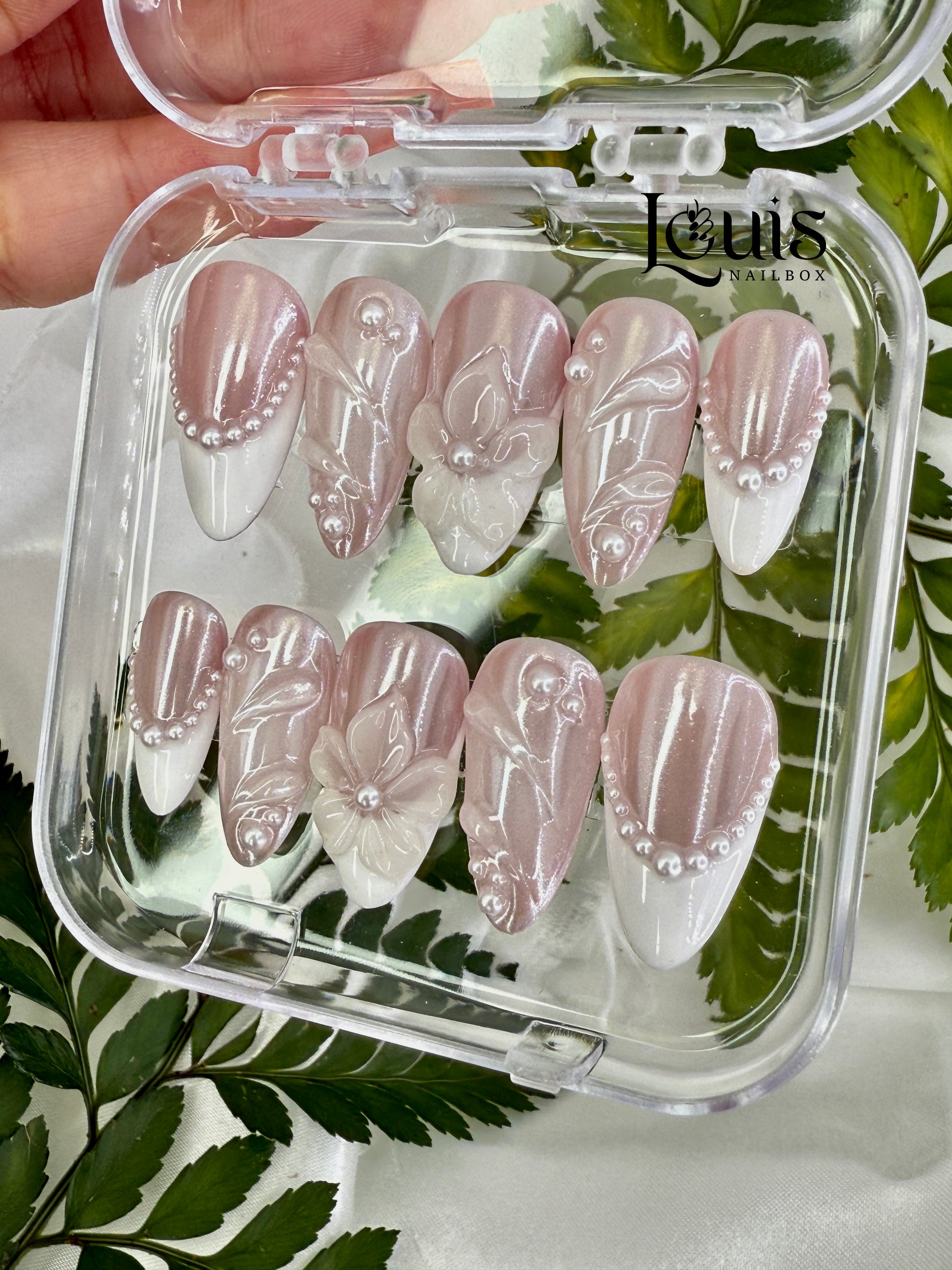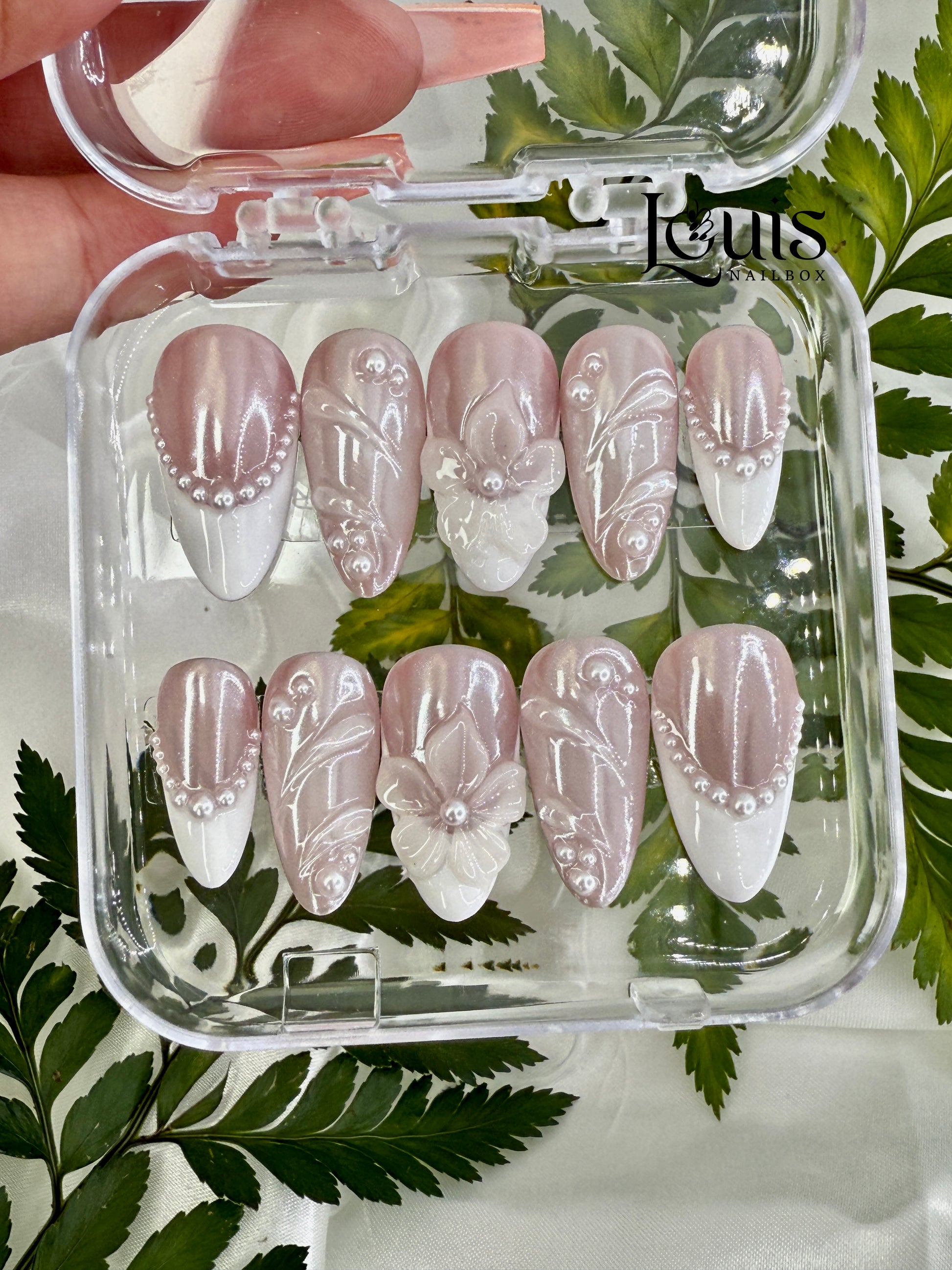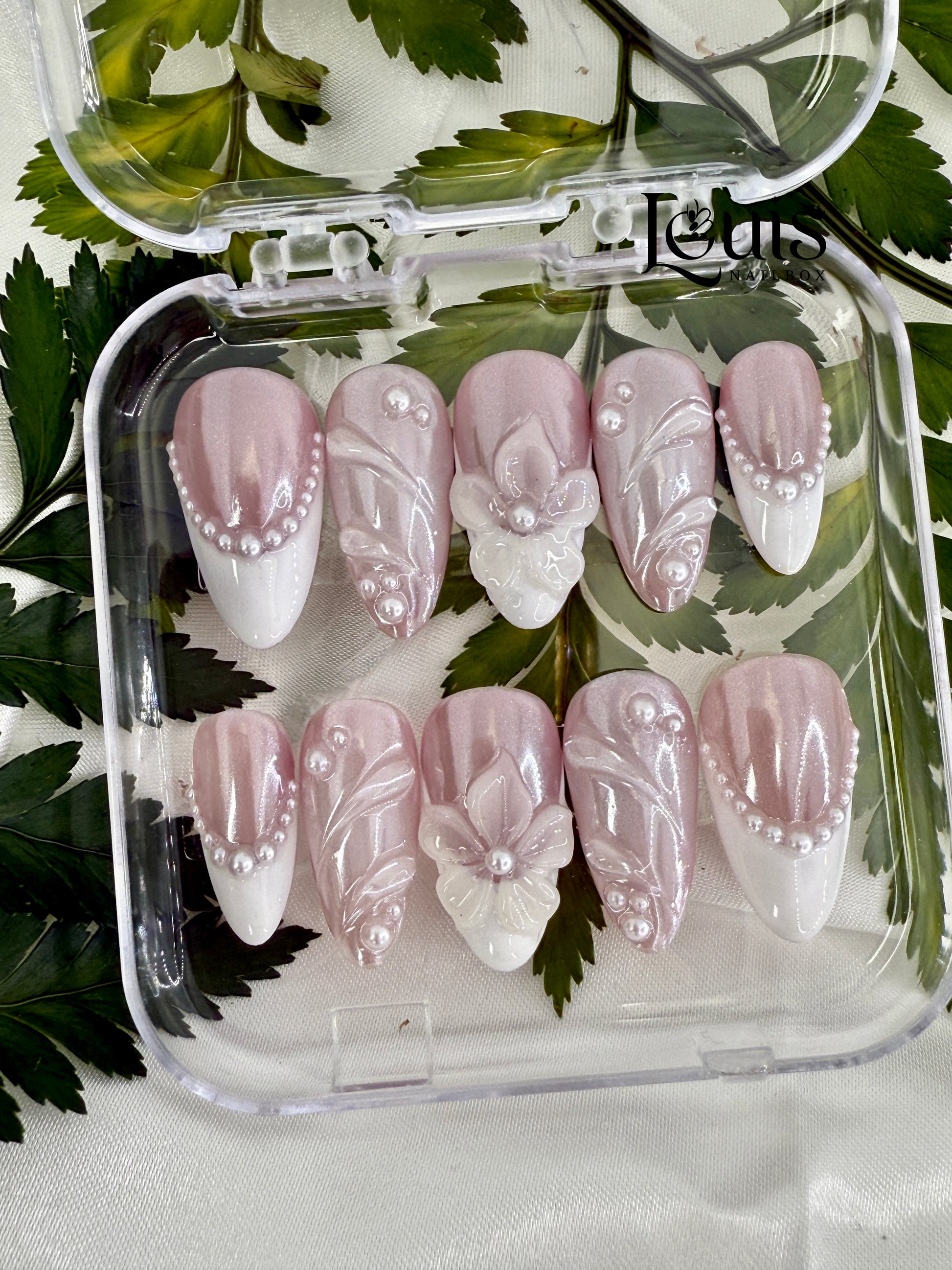 Indulge in romantic elegance with our Pearl Lace LouisNailBox! Featuring soft mauve bases with crisp white tips, intricate lace florals, 3D bows, and cascading pearl beads for a bridal-inspired shimmer.