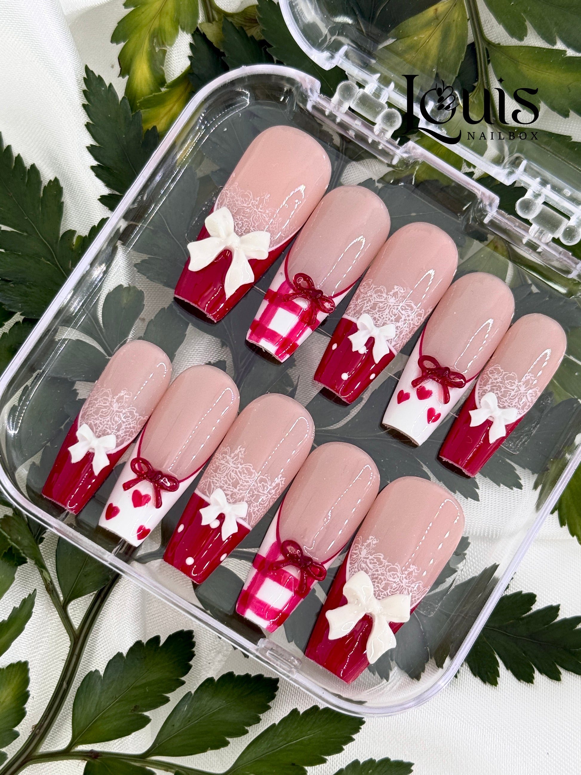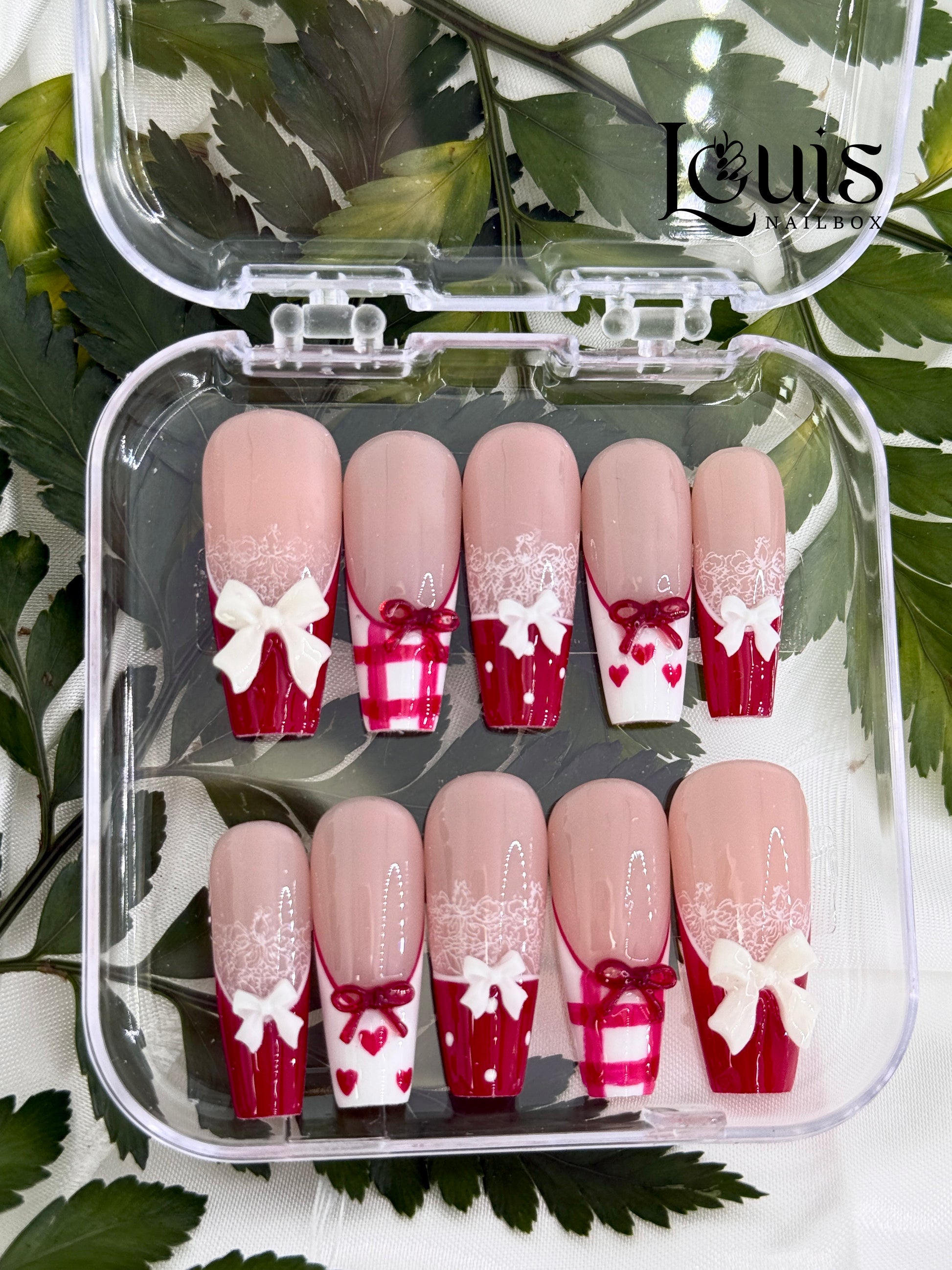 Celebrate whimsy with our Plaid Bow Bliss LouisNailBox! Featuring red gingham plaids, delicate lace overlays, 3D bows, and heart accents on nude bases with white tips for a romantic, picnic-perfect vibe.