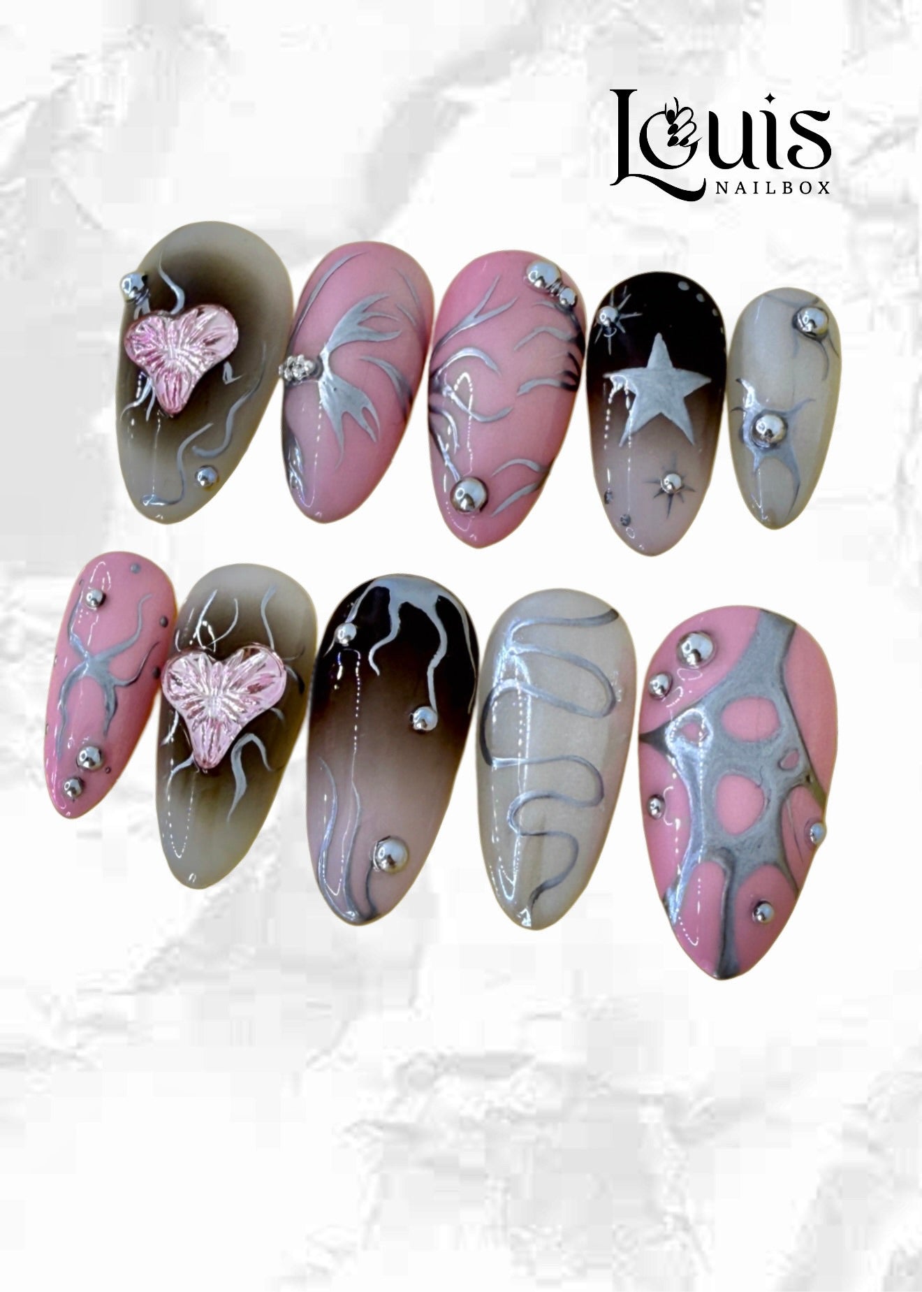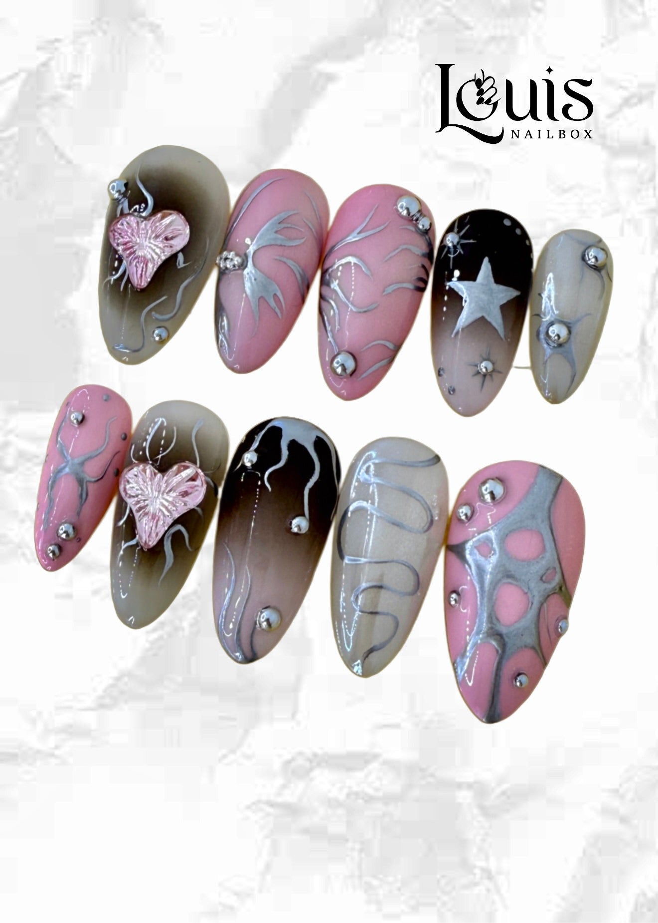 Romantic Fusion set from LouisNailBox! A playful mix of pink, beige, and gray tones with swirling silver patterns, heart-shaped gems, and pearl beads for a romantic flair.