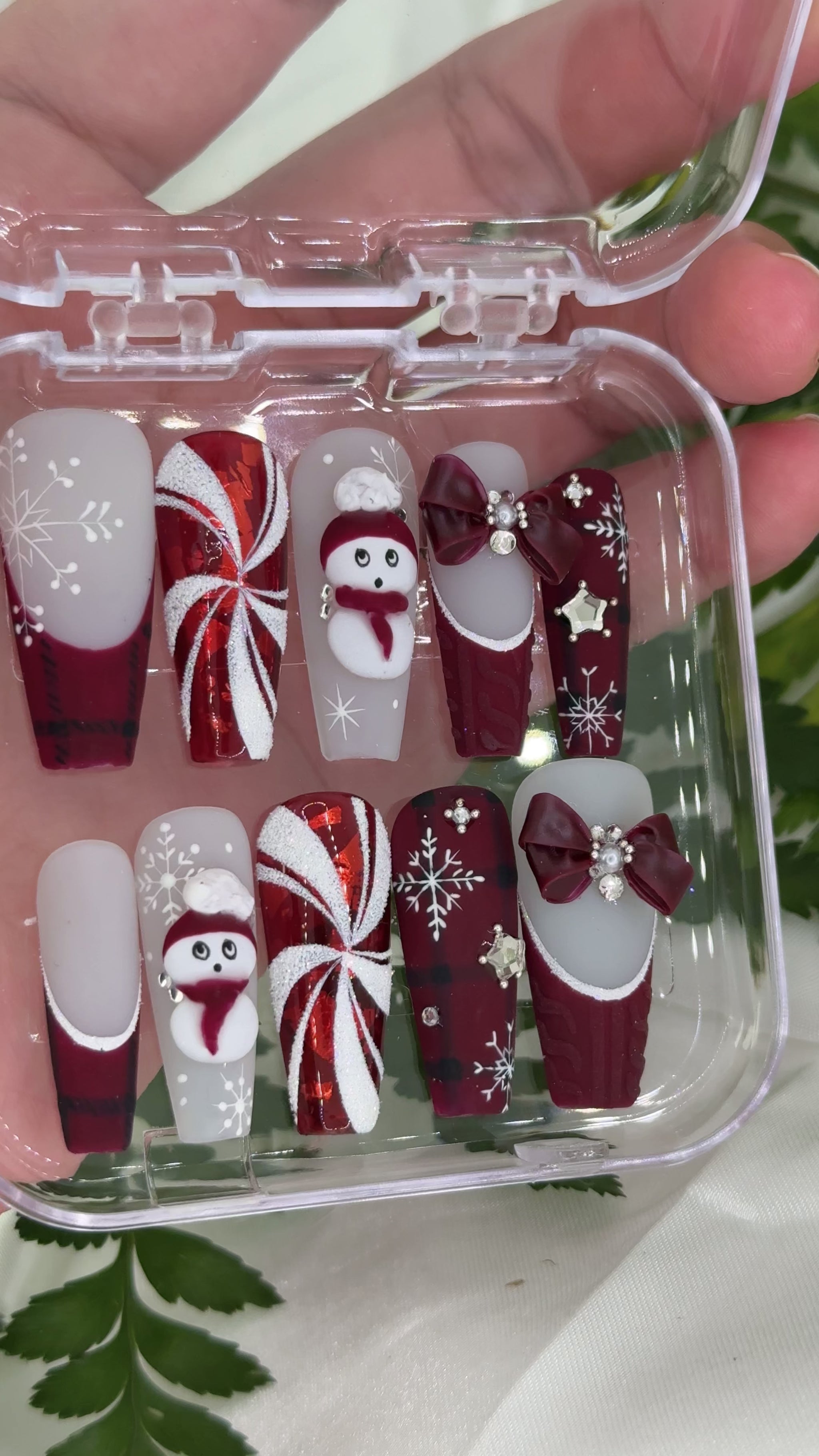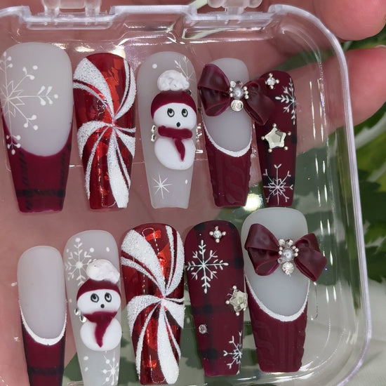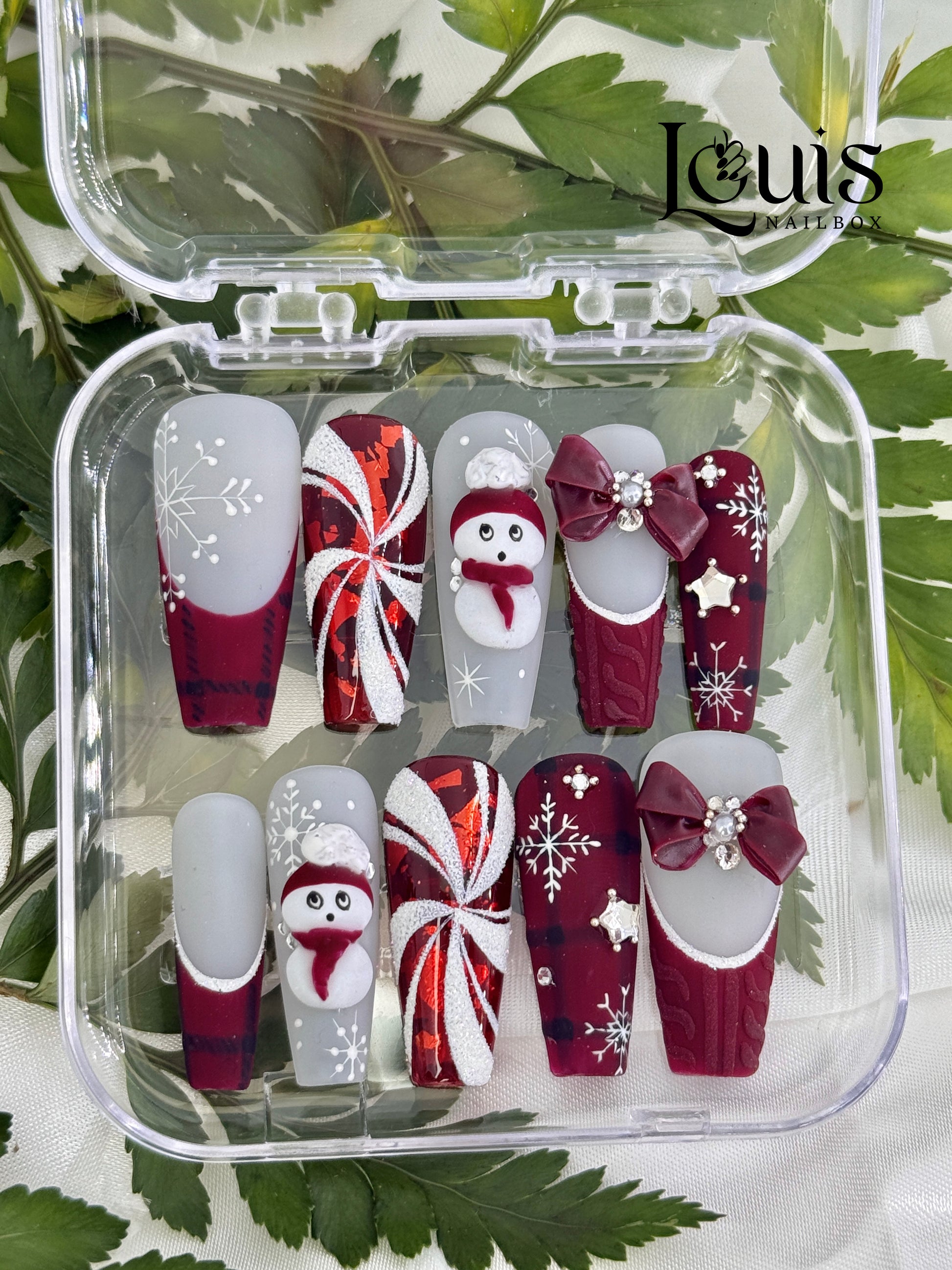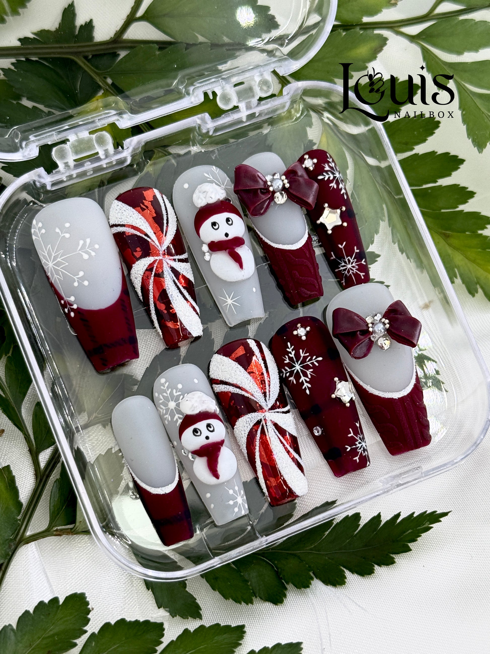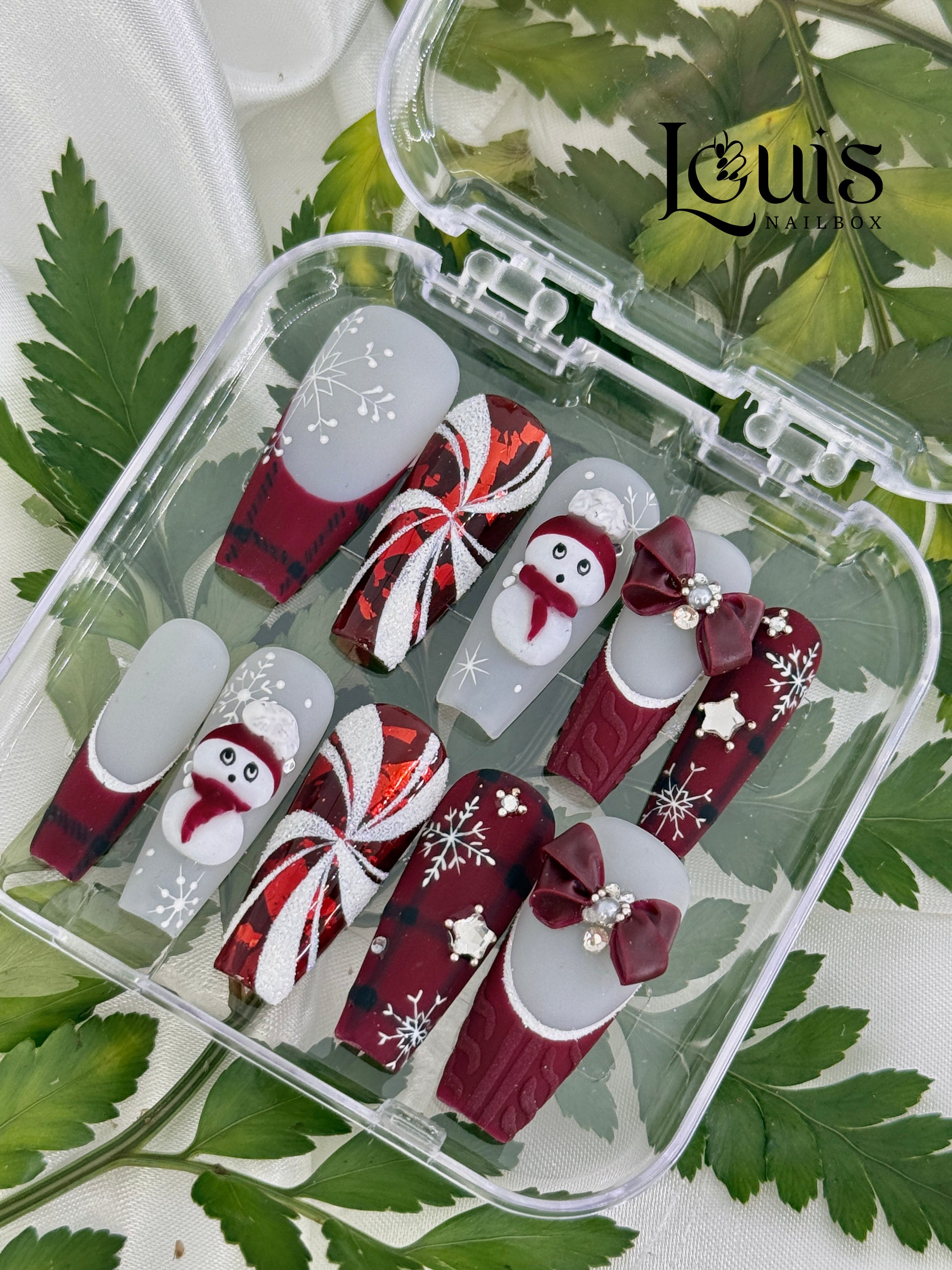 Build festive cheer with our Snowman Plaid LouisNailBox! Cozy tartan plaids, 3D snowmen, swirling candy canes, and starry snowflakes on gray and burgundy bases for a whimsical holiday glow.
