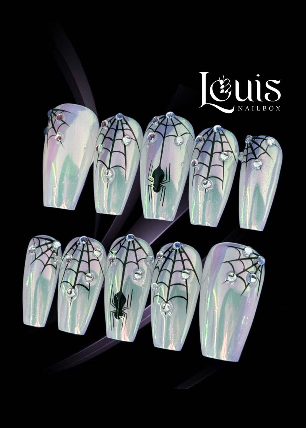 Embrace the spooky elegance with our Spider Web LouisNailBox!Featuring iridescent finishes, intricate spider web designs, and dazzling rhinestone accents, these salon-quality nails are perfect for a hauntingly chic look.