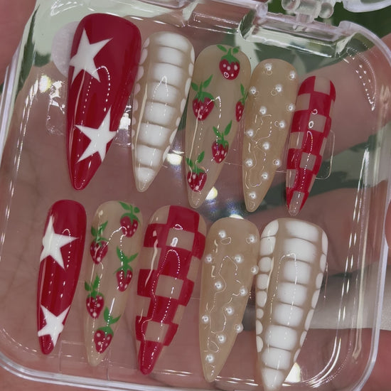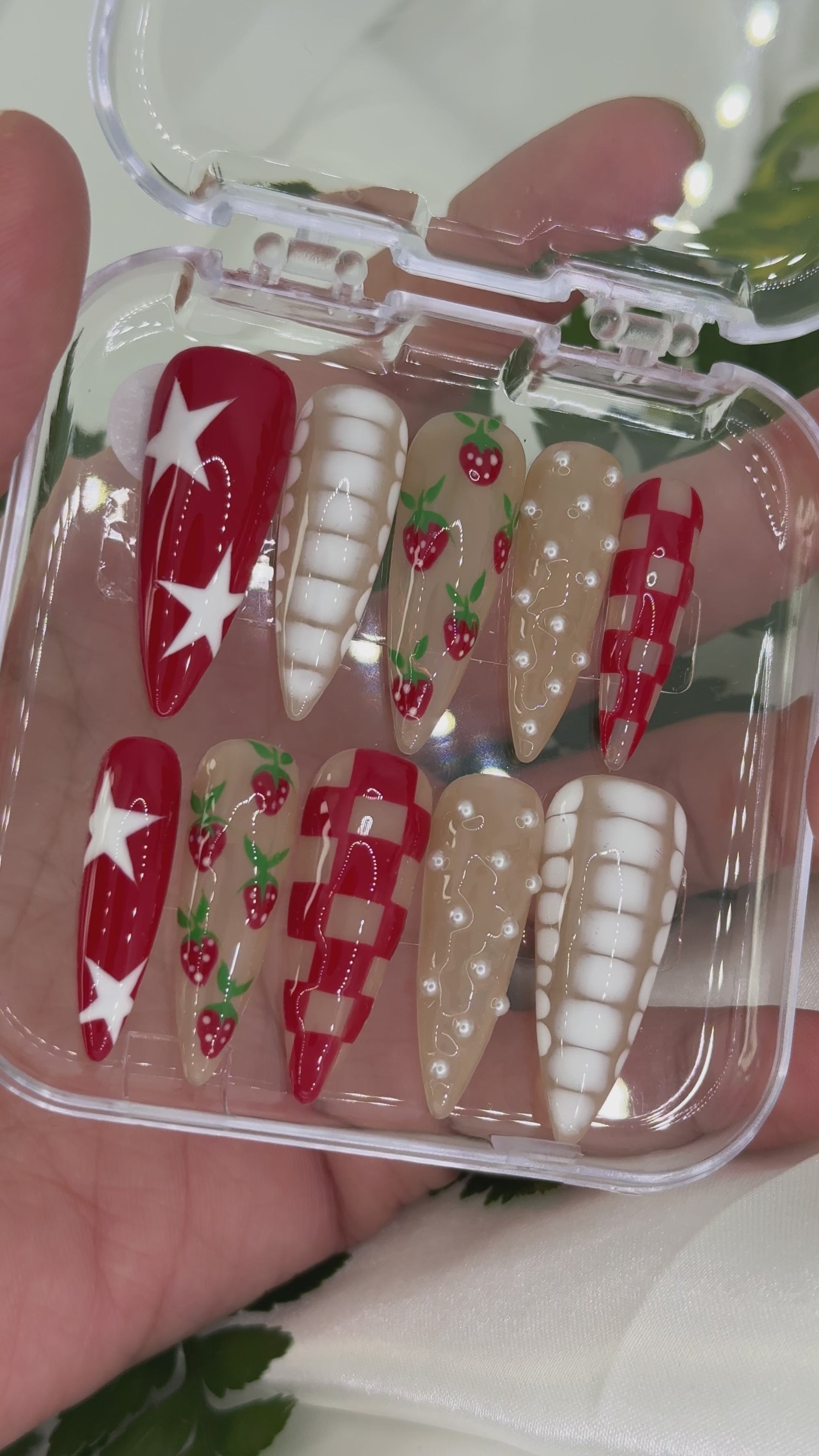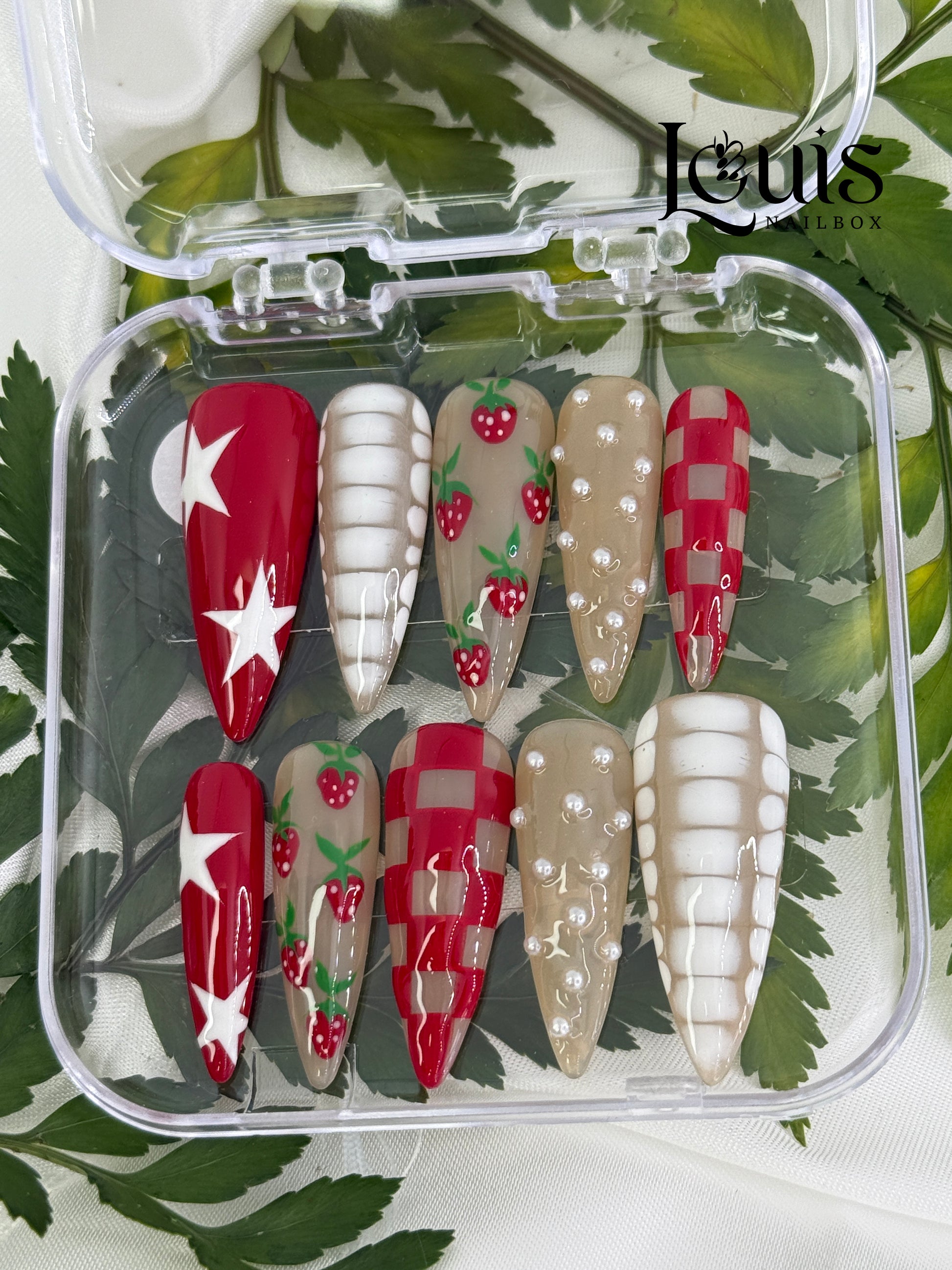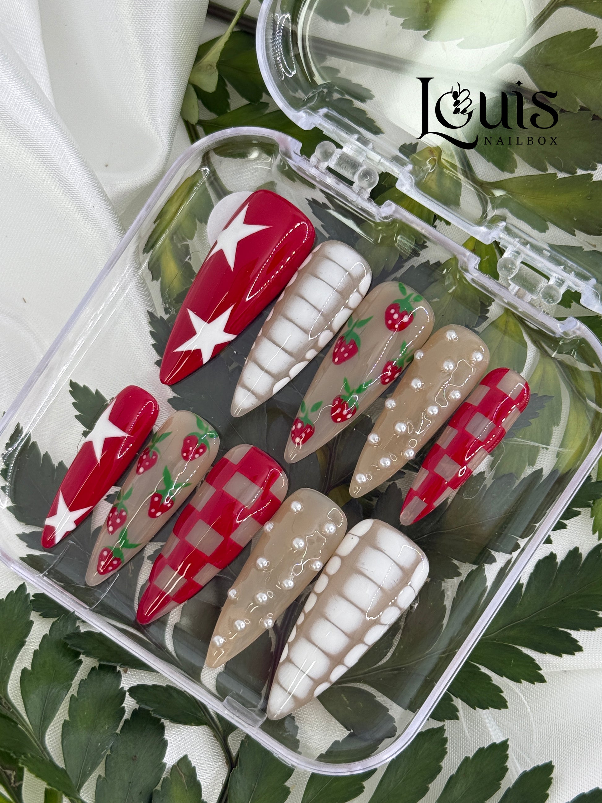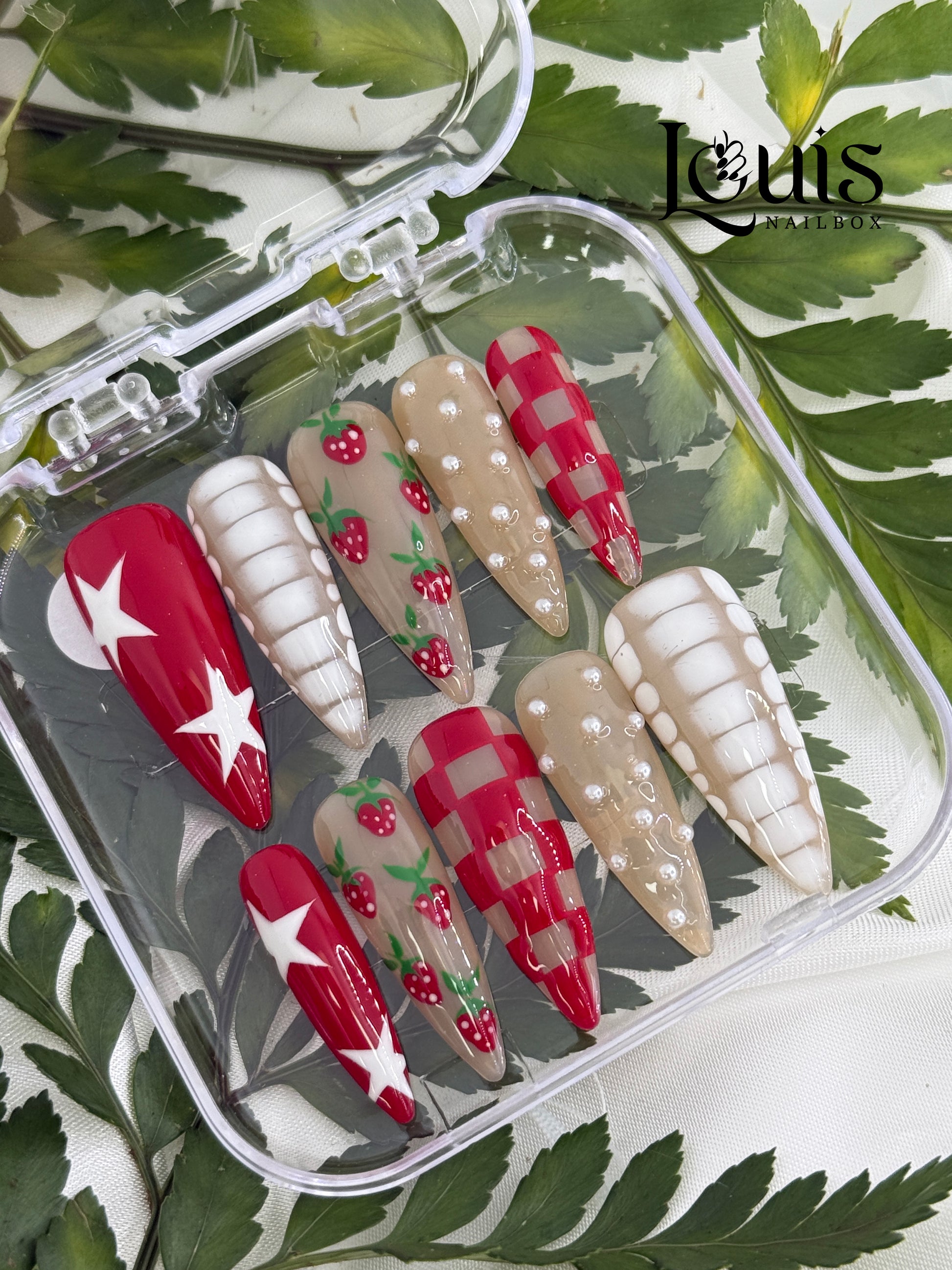 Sweeten your style with our Strawberry Star LouisNailBox! Adorned with glossy strawberries, white stars, gingham plaids, and pearl dots on beige and red bases for a festive, berry-licious vibe.