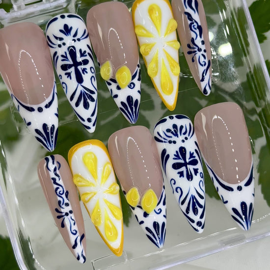 Infuse your look with vibrant artistry in our Talavera Lemon LouisNailBox! Inspired by Mexican Talavera pottery, these feature intricate blue-and-white floral patterns, 3D yellow lemon blooms, and subtle nude bases for a cultural, citrusy elegance.