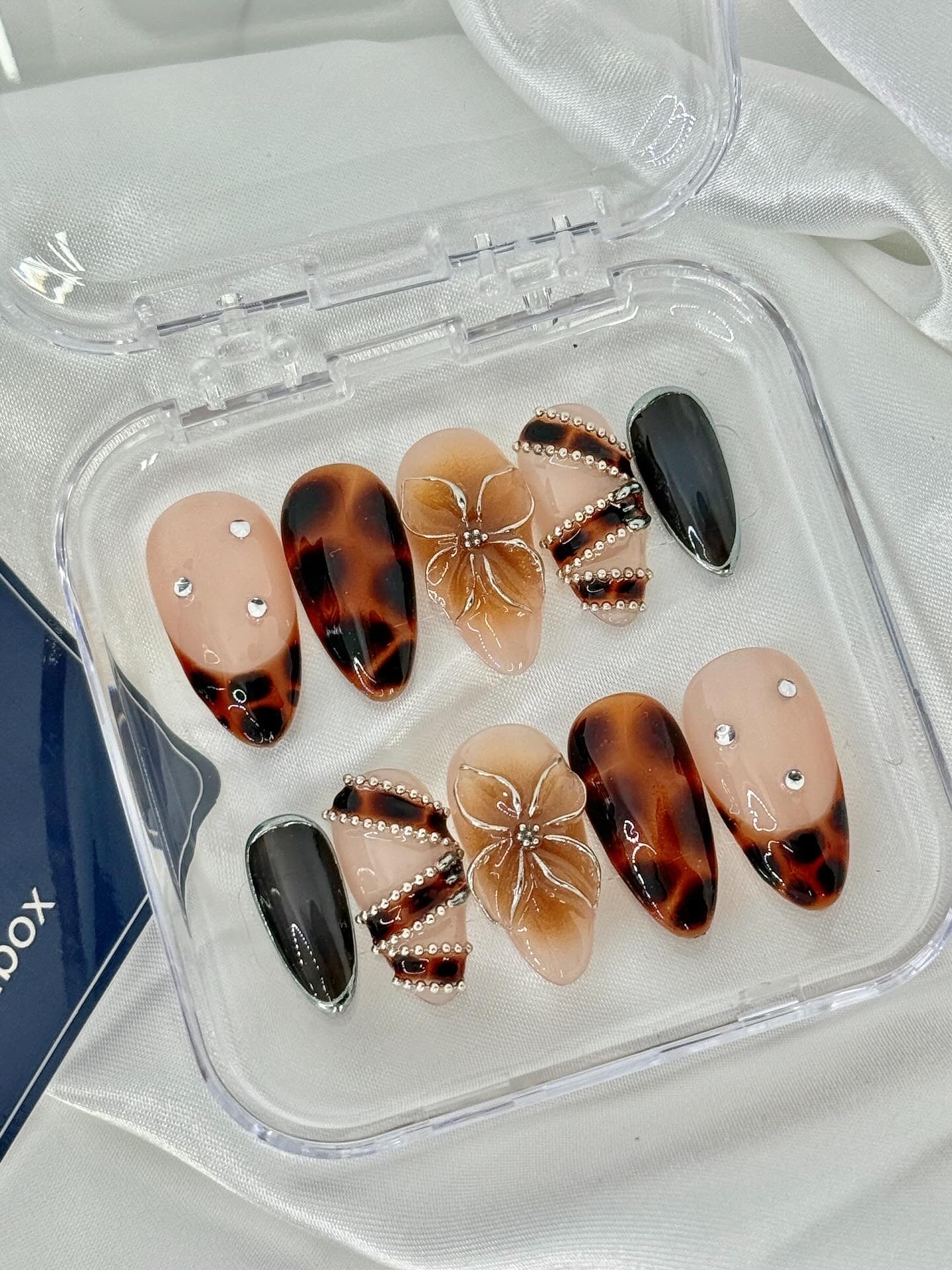 Unleash your wild side with our Tortoise Shell LouisNailBox Boasting a trendy tortoiseshell pattern with rhinestone and floral details, these nails are both stylish and durable. Pre-designed and easy to apply with adhesive included.