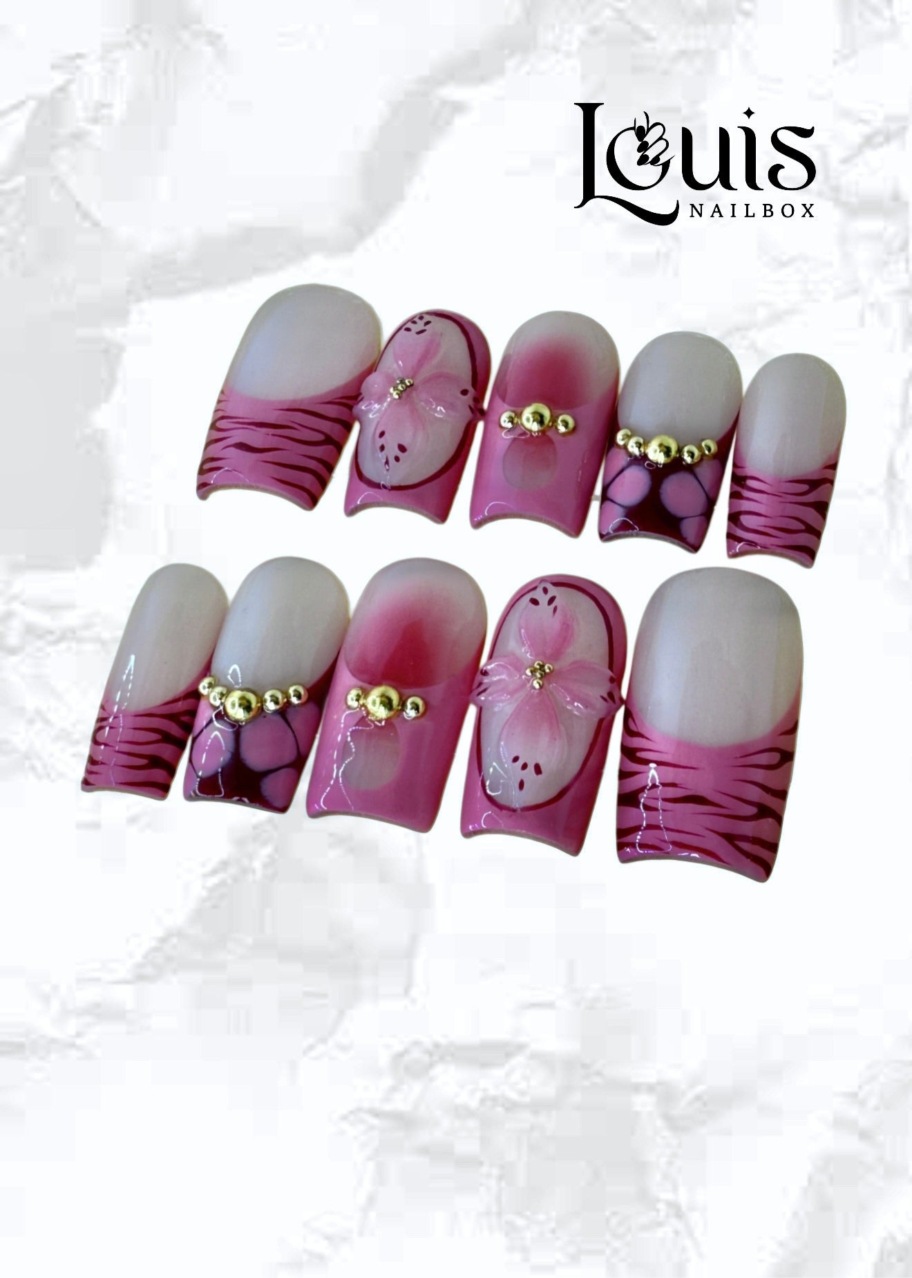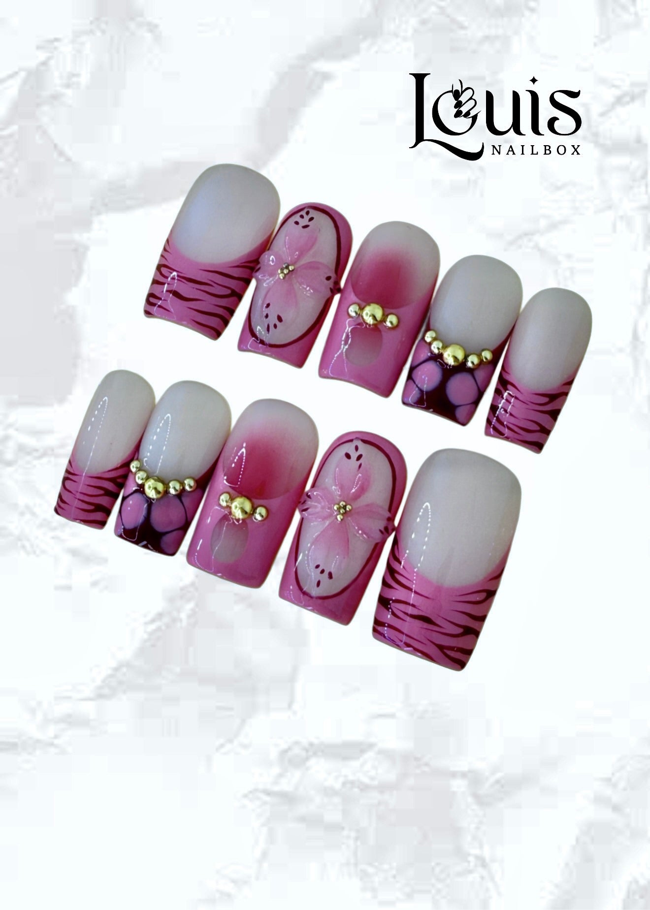 Tropical Blossom set from LouisNailBox! A vibrant pink and white design featuring delicate floral accents and golden bead embellishments, exuding a tropical elegance.