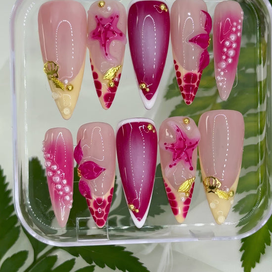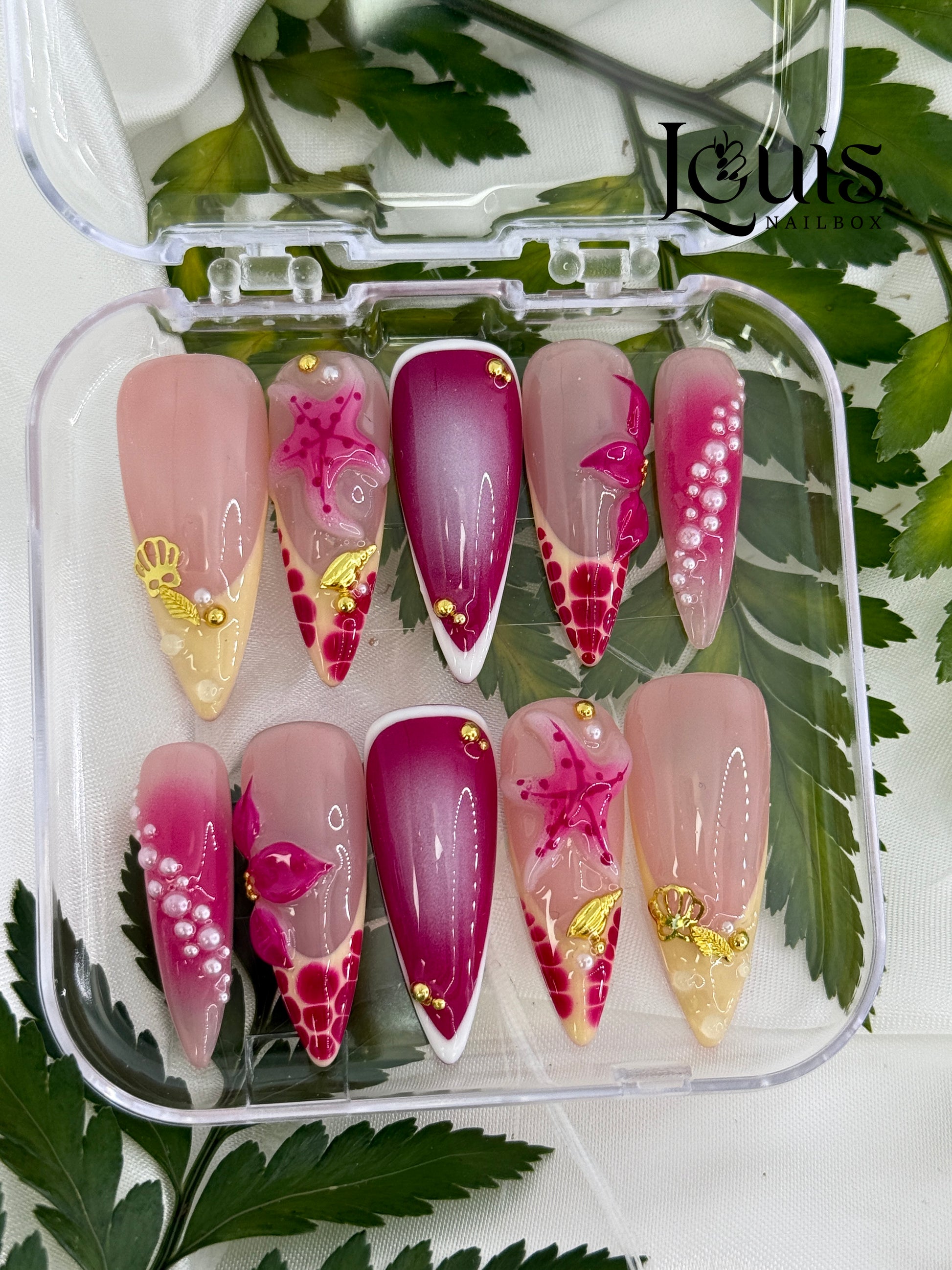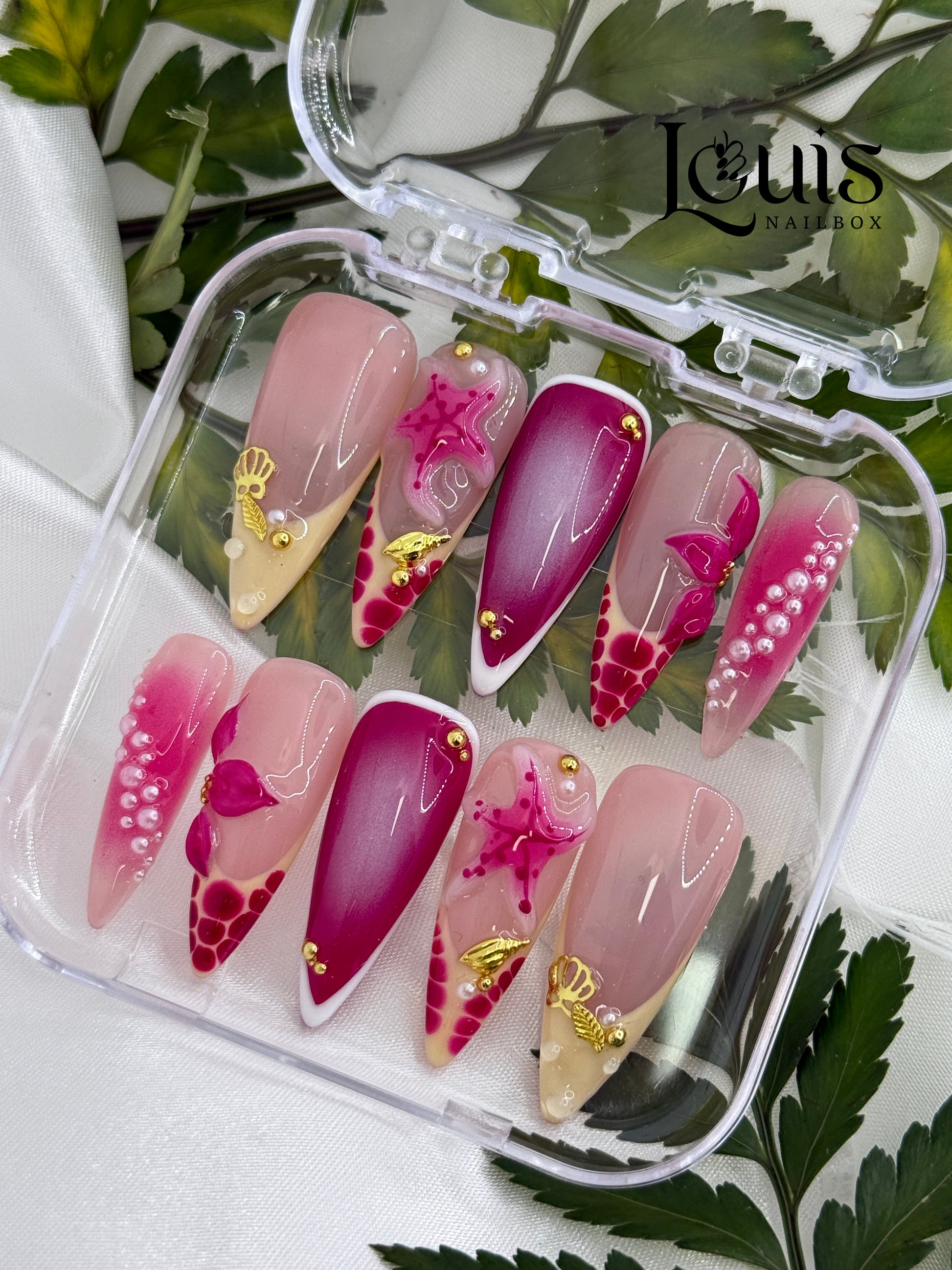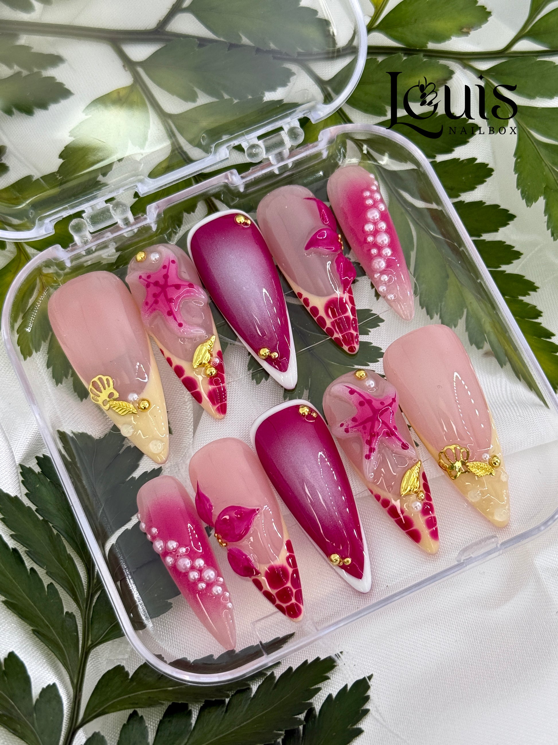 Dive into seaside glamour with our Tropical Starfish LouisNailBox! Featuring iridescent pink starfish, gold seashells, pearl beads, floral motifs, and cheetah prints on nude and burgundy bases for a vibrant, beach-ready escape.